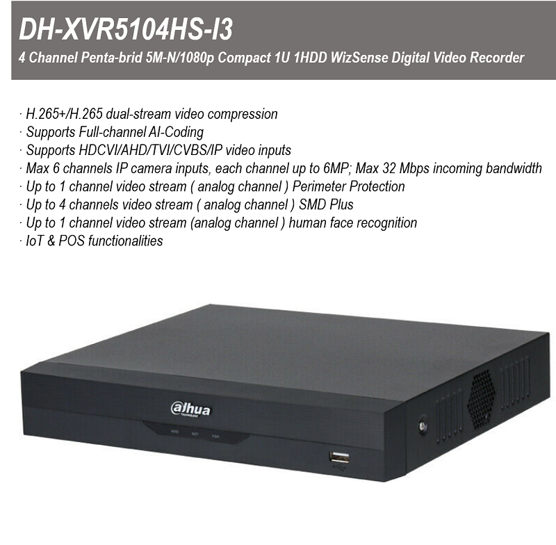 Dahua XVR5104HS-I3 4CH XVR [Penta-brid 5M-N/1080P Compact 1U WizSense 4 Channel Digital Video Recorder (DVR) PC-Mobile APP:iDMSS Lite/DMSS]