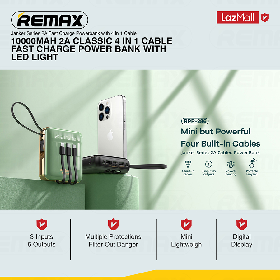 [Remax Energy] RPP-286 10000mAH 2A Classic Mini Lightweight Fast Charge Power Bank With LED Flash Light + 4 In 1 Cable