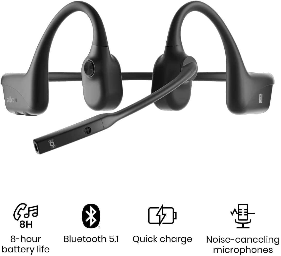 Shokz OpenComm - Black | Bone Conduction Open-Ear Stereo Wireless Bluetooth Headset with Noise-Canceling Boom Microphone