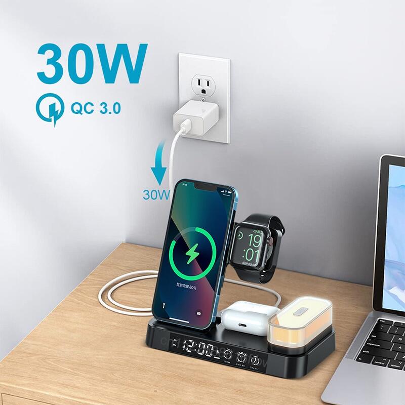 HOCE 30W 3 in 1 Qi Wireless Charger For iPhone 14 13 12 11 Pro Max XR XS X Apple Watch 8 7 6 5 4 3 2 SE Alarm Clock Fast Charging Station With LED Light For Airpods Pro 3