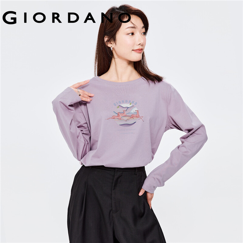 GIORDANO Women ARTAND Series T-Shirts Comfy 100% Cotton Spring Fall Casual Tee Print Pattern Long Sleeve Crewneck Tee 99392102